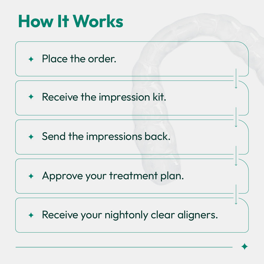 You’ll receive an impression kit, 3D treatment plan, custom aligners (dual arch), whitening kit, chewies, pull tool, retainers, and a case.